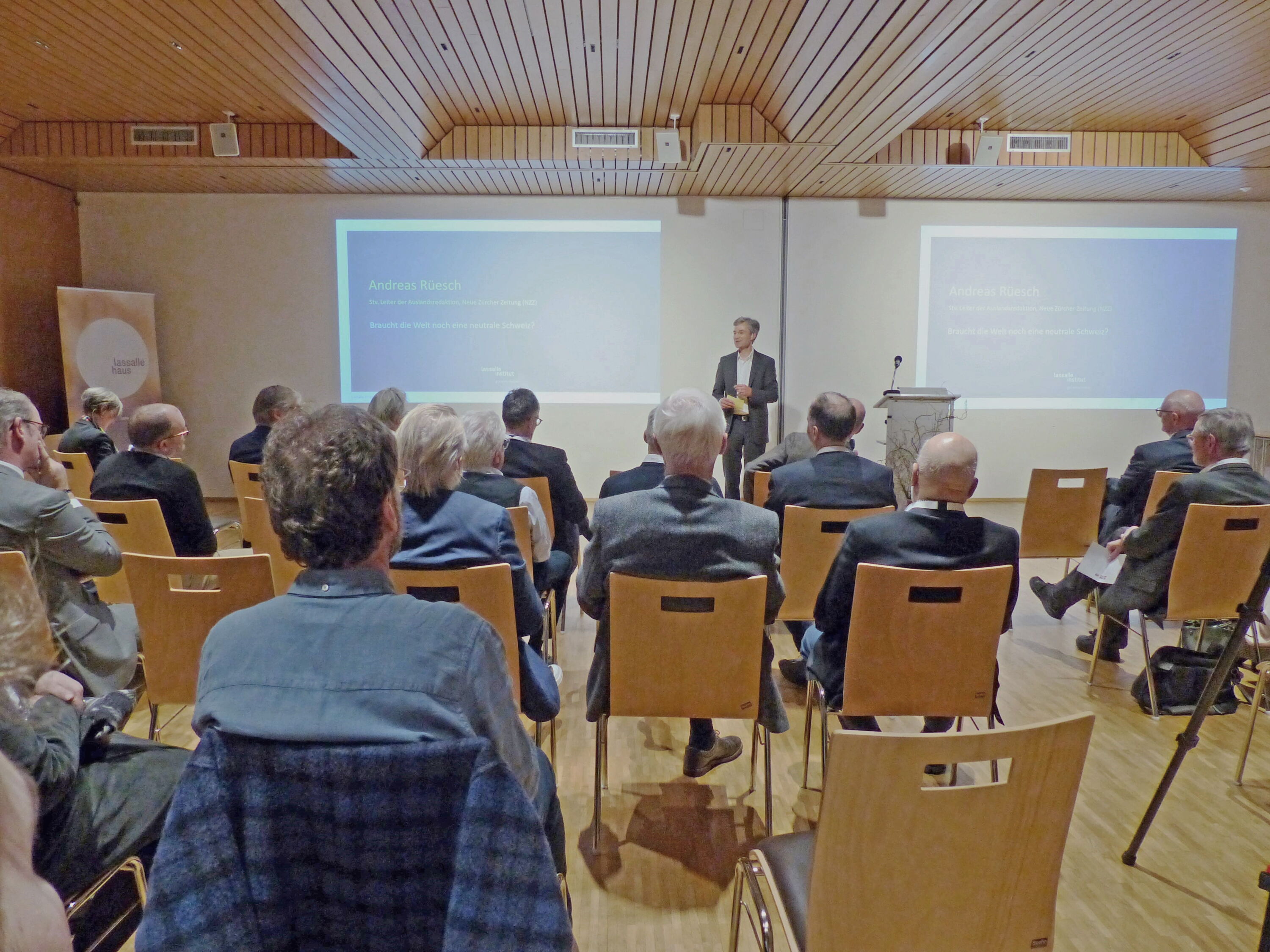 Ein Schwerpunkt lag zwar auf der staatlichen Neutralität, zu der sich der stellvertretende Leiter der NZZ-Auslandredaktion, Andreas Rüesch, pointiert äusserte. Mit weiteren Referaten diskutierten der Unternehmer Klaus Wellershoff und die Terre des Hommes-Generaldirektorin Barbara Hintermann die Neutralität als ein Leitprinzip für Unternehmen und Hilfsorganisationen.