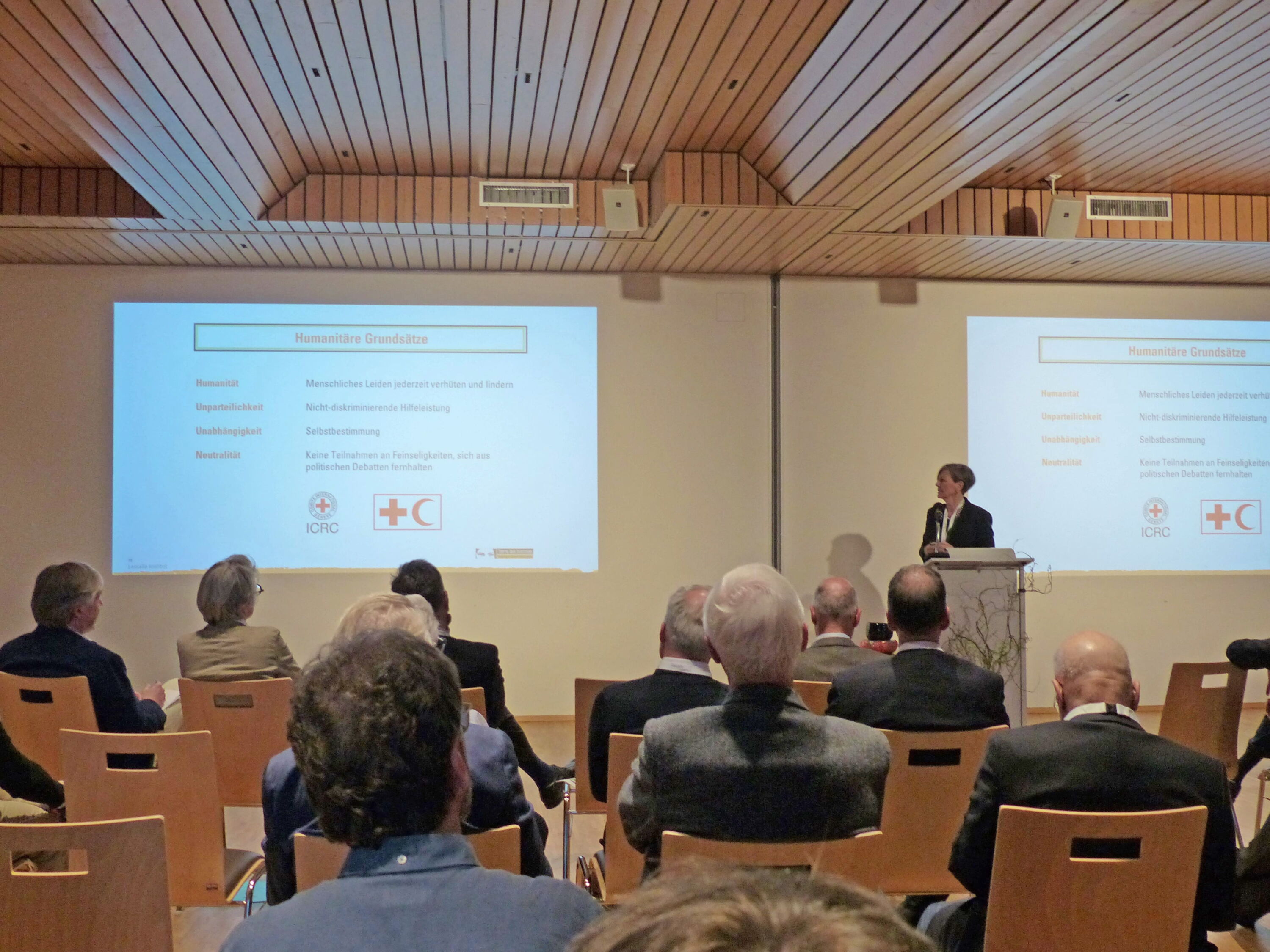 Barbara Hintermann vom Kinderhilfswerk Terre des Hommes nahm nicht eine staatspolitische Perspektive ein. Sie beleuchtete Neutralität als ein Prinzip internationaler humanitärer Aktion. Und erklärte an konkreten Beispielen, inwieweit dieses Prinzip, in Verbindung mit den Prinzipien von Unparteilichkeit und Unabhängigkeit, humanitär erfolgreich war. Ohne Einhaltung dieser Prinzipien könnten Hilfswerke wie Terre des Hommes oder das Rote Kreuz in Krisenregionen kaum konkrete Hilfe leisten.