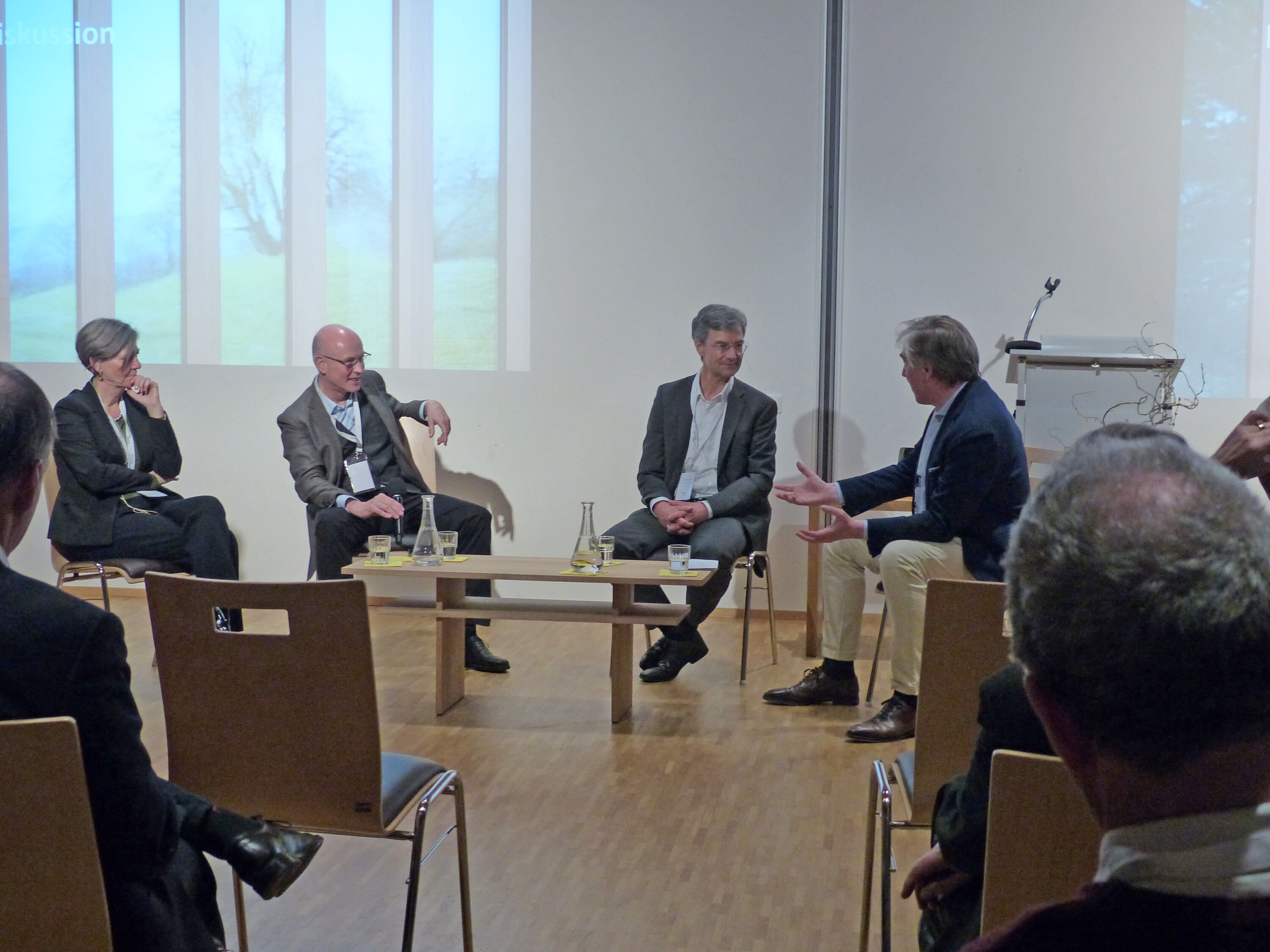 Die Referierenden im Gespräch mit Tobias Karcher SJ.